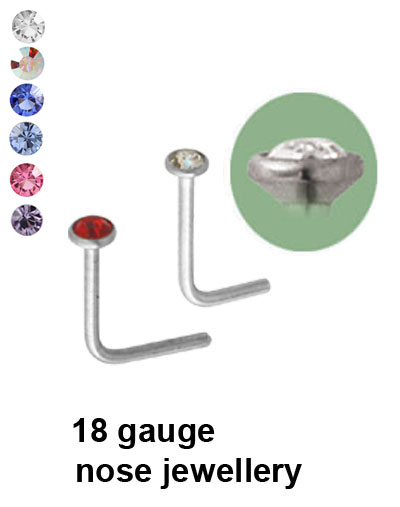316L surgical steel bezel set nose studs with 90° bend. 18 gauge post.
