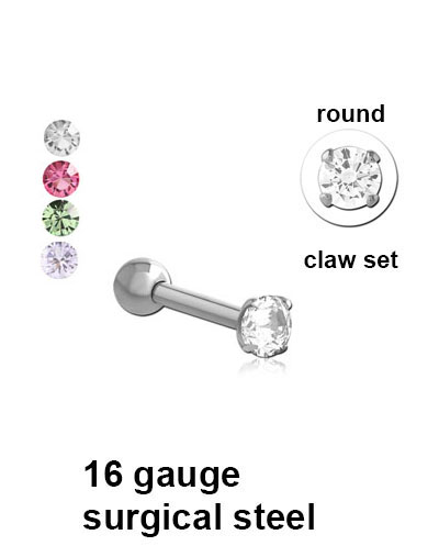 This 16g tragus piercing has a claw setting stone and is available in 6mm and 8mm length.