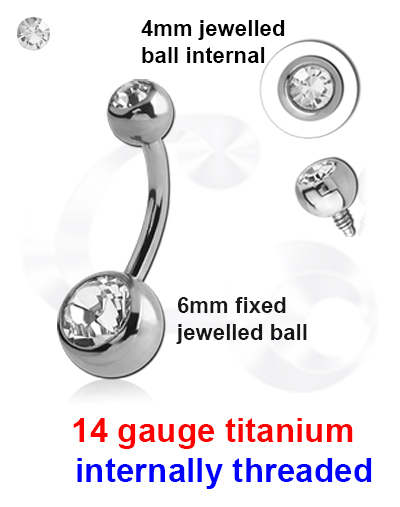 Curved internal navel jewelled Titanium 6Al-4V-Eli ASTM F-136 barbell has 4/6mm balls – 14g only.