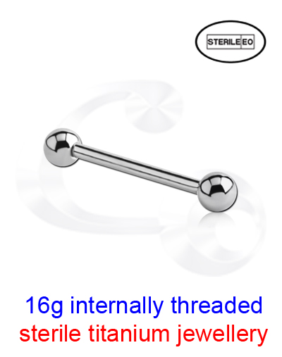 Sterile 16g internally threaded titanium 6Al-4V-Eli ASTM F-136 barbell.  One time use only.