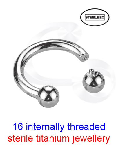 Sterile 16g internally threaded titanium 6Al-4V-Eli ASTM F-136 micro circular barbell.  One time use only.